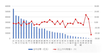 圖 6 2025 年上半年各地區(qū)建筑業(yè)企業(yè)合同總額及其增長情況